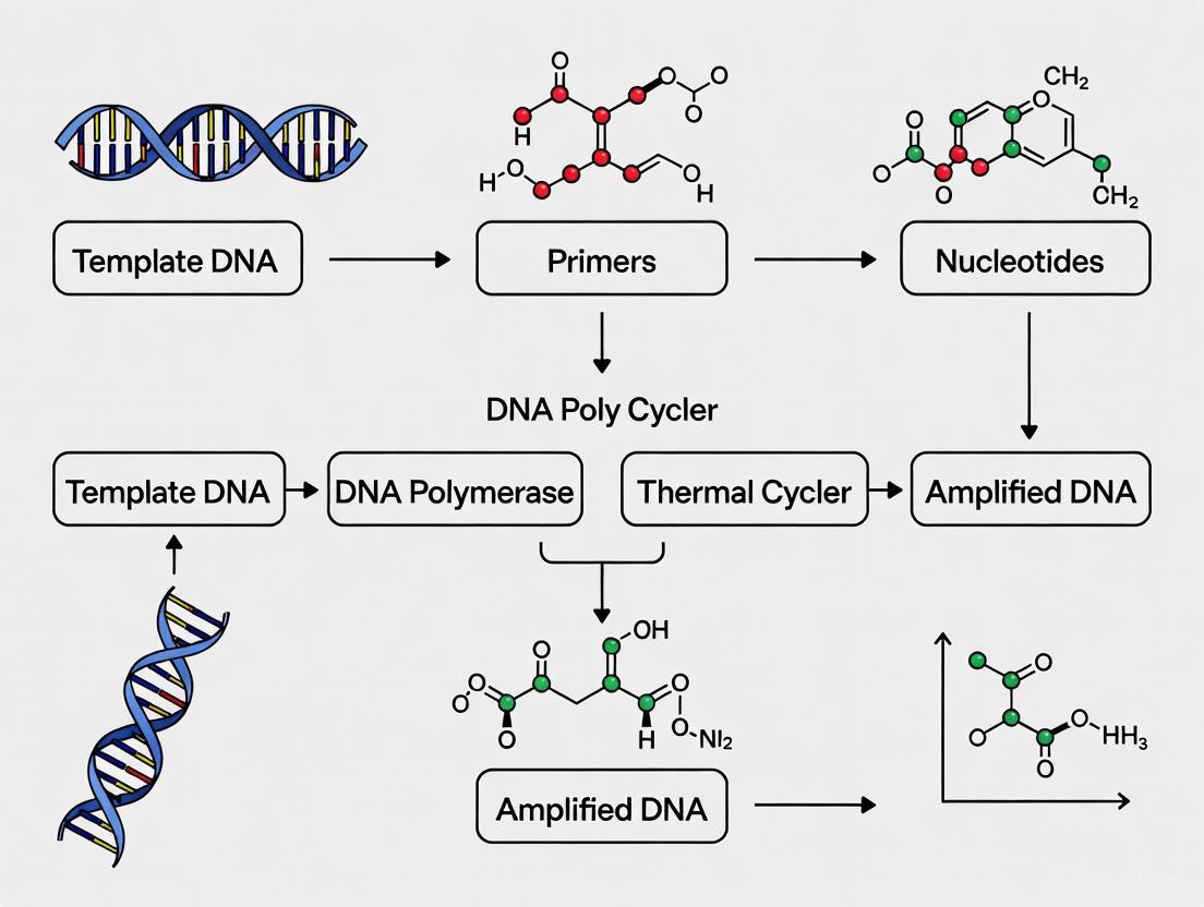 The polymerase chain reaction (PCR) is a method for exponentially amplifying specific fragments of DNA through repeated thermal cycles. The DNA polymerase enzyme is the core component of this system, catalyzing the synthesis of new DNA strands by incorporating nucleotides complementary to a target template. The earliest PCR protocols utilized the Klenow fragment of E. coli DNA Polymerase I, which had to be replenished after each denaturation cycle due to its heat lability. This limitation was overcome by the discovery and adoption of Taq DNA Polymerase, a thermostable enzyme isolated from the thermophilic bacterium Thermus aquaticus found in the hot springs of Yellowstone National Park [12] [13]. Its ability to withstand the high temperatures required for DNA denaturation (typically >90°C) revolutionized PCR, transforming it into a simple and robust technique performed in a single tube [12].