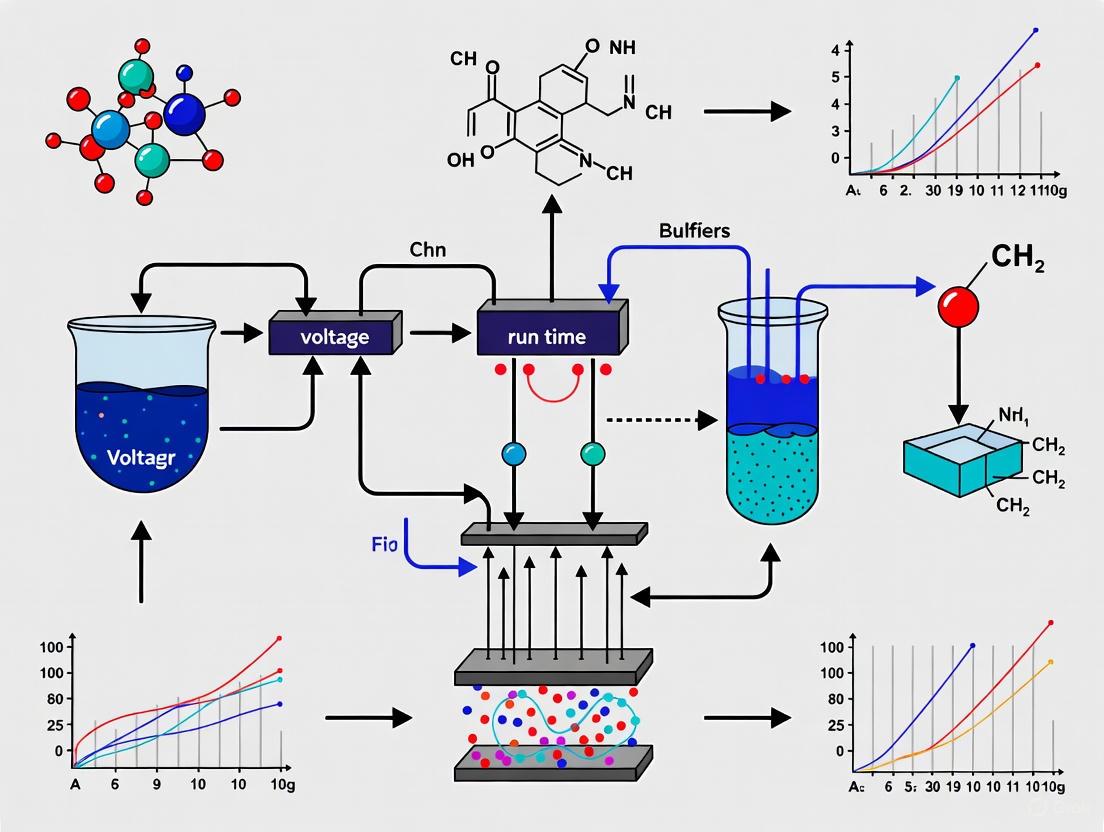 Mastering the interplay between voltage and run time is fundamental to achieving clear, reproducible protein separation. This synthesis of foundational principles, optimized protocols, and troubleshooting strategies provides a clear roadmap for researchers to overcome common electrophoretic challenges, especially with high molecular weight targets. As proteomic analyses and biopharmaceutical development increasingly demand higher sensitivity and precision, the systematic optimization outlined here will be crucial for advancing research in biomarker discovery, structural biology, and therapeutic protein characterization. Future directions will likely integrate intelligent, automated systems for real-time parameter adjustment, further enhancing reproducibility and efficiency in protein analysis.