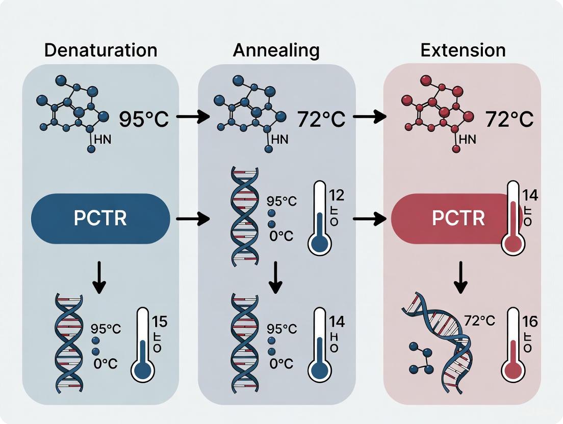 The PCR process employs repeated thermal cycling to drive the targeted amplification of DNA. Each cycle theoretically doubles the amount of target DNA, leading to exponential accumulation. The core mechanism consists of three sequential temperature-dependent steps.