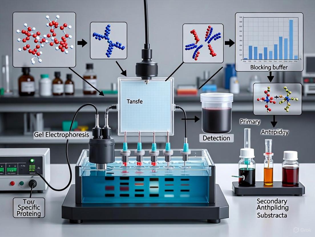 The Western blotting procedure involves a multi-stage process that ensures specific detection of target proteins amidst complex protein mixtures. The procedure refers to the comprehensive process described in technical protocols, encompassing all steps from protein separation to detection [9]. The method relies on separating proteins by size using SDS-PAGE, transferring them to a membrane, and probing with antibodies specific to the target protein [9].